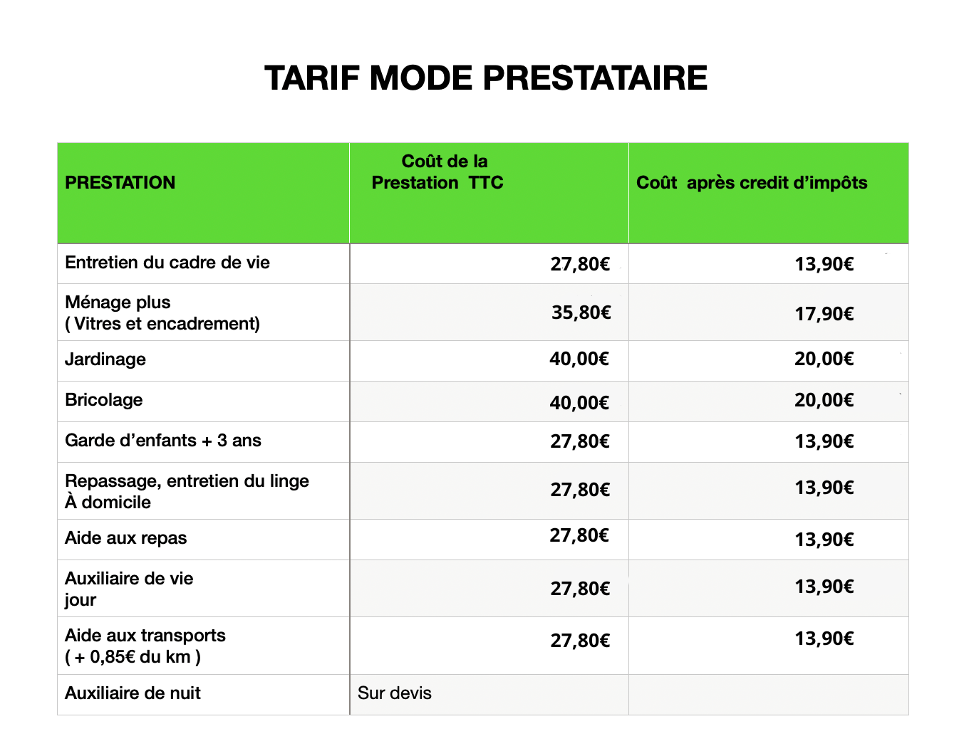 Les tarifs indiqués ci-dessous comprennent la présélection de votre Aide à Domicile, les modalités liées à la relation de travail qui vous lient via votre rôle de particulier employeur (contrat de travail, versement du salaire...).